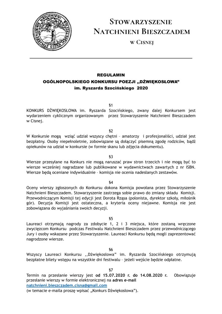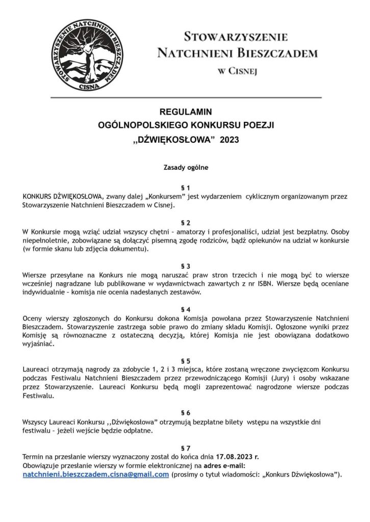 ℹ️ Ogłaszamy nabór do Ogólnopolskiego Konkursu Poezji „Dźwiękosłowa” w ramach XV Festiwal Natchnieni Bieszczadem w Cisnej 18-19 SIERPNIA 2023. 📜 Jeżeli chcesz pokazać swoją twórczość na scenie Festiwalu, poezja jest Ci bliska – czekamy na zgłoszenia najpóźniej do końca dnia 17 sierpnia pod adresem 📅📩 natchnieni.bieszczadem.cisna@gmail.com (szczegóły Konkursu w regulaminie poniżej). Ogłoszenie wyników 18 sierpnia