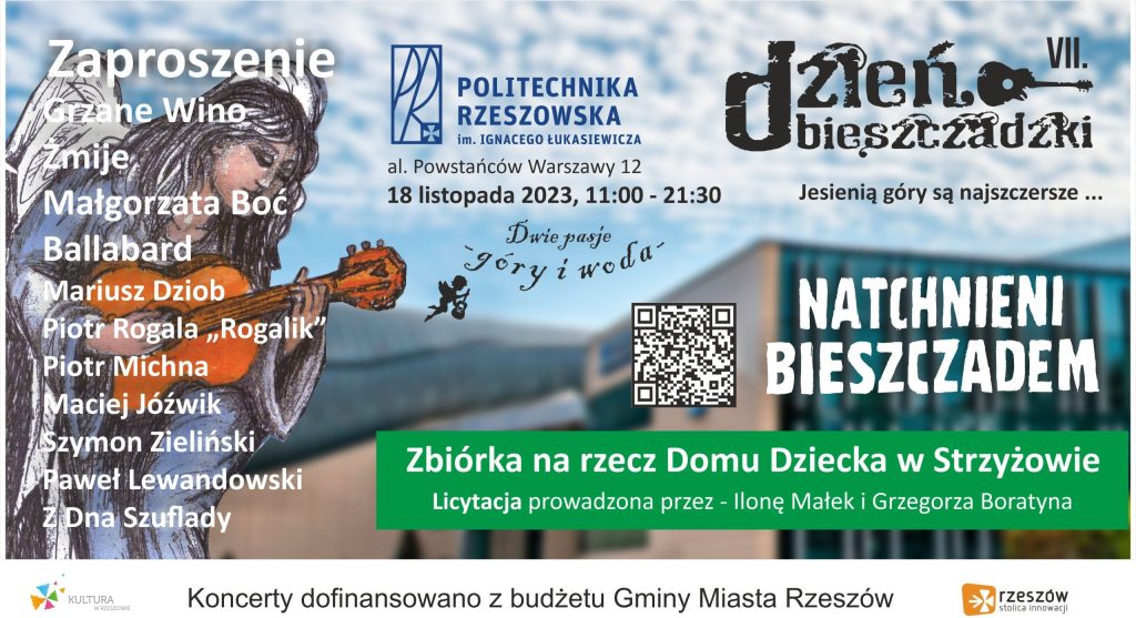 Już w najbliższą sobotę, 18 listopada „Bieszczady przyjadą do Rzeszowa” Zapraszamy na kolejne wydarzenie z cyklu „BIESZCZADZKIE CZTERY PORY ROKU” jakim jest @VII DZIEŃ BIESZCZADZKI „Jesienią góry są najszczersze” na Politechnice Rzeszowskiej 18/11/2023 Więcej informacji: www.facebook.com/events/1026845468441579 WSTĘP WOLNY Podczas wydarzenia: koncerty zespołów i artystów z Podkarpacia, Bieszczadów i nie tylko, Zbiórka na rzecz Domu Dziecka […]