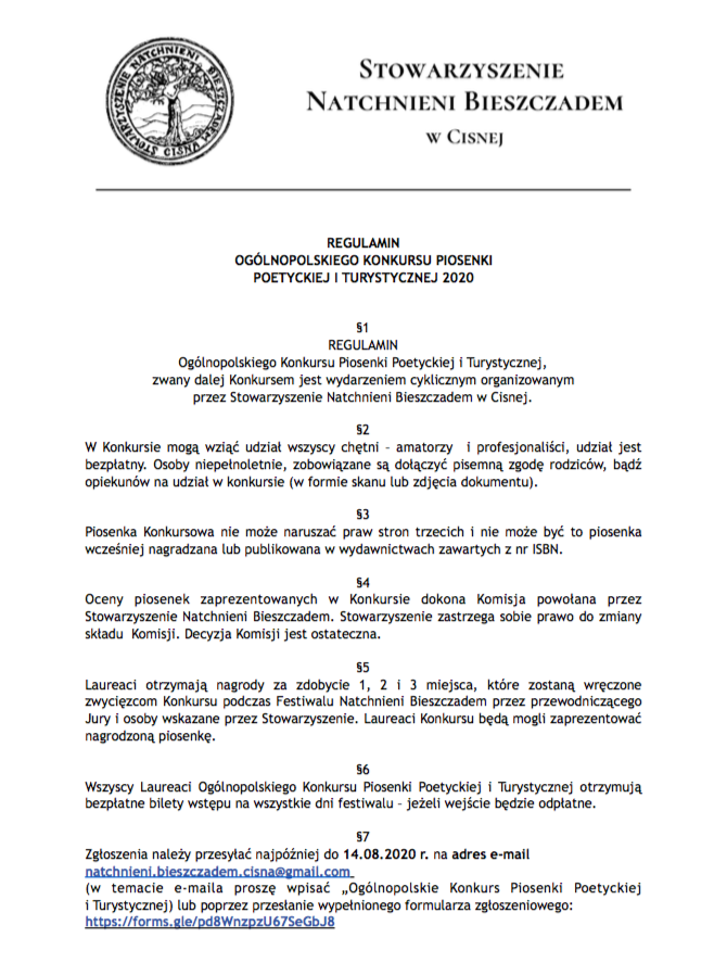 Zapraszamy do zapoznania się z Regulaminem XII Festiwalu Natchnieni Bieszczadem w Cisnej 21-22 sierpnia 2020 r.Uczestnictwo jest równoznaczne z akceptacją Regulaminu, a uczestnik zobowiązany jest przestrzegać jego zapisów. Regulamin dostępny tutaj: https://tiny.pl/71xt3